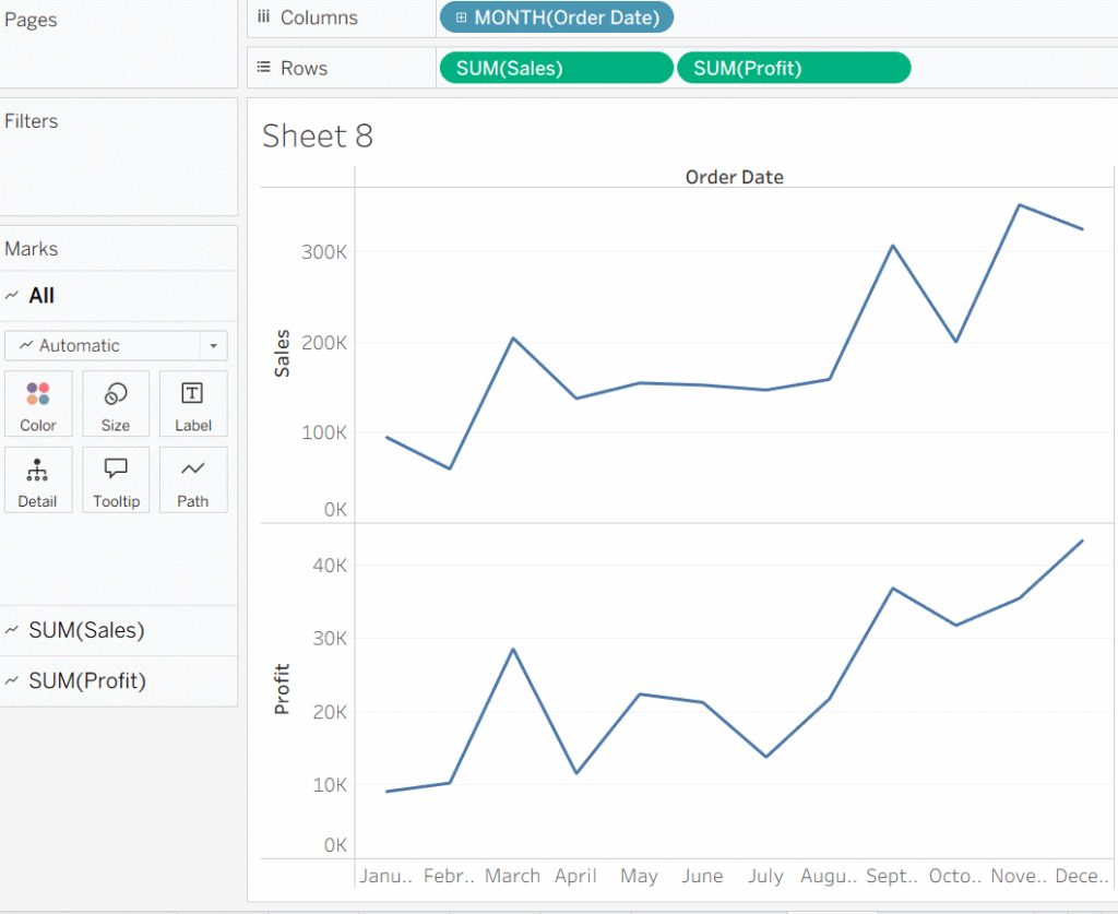 Step 1: Drag the order date from the data pane to the columns, then click on the order date’s dropdown menu and select month. Also place sales and profit to the rows shelf. You will notice two graphs in the view, one for sales and another for profit.