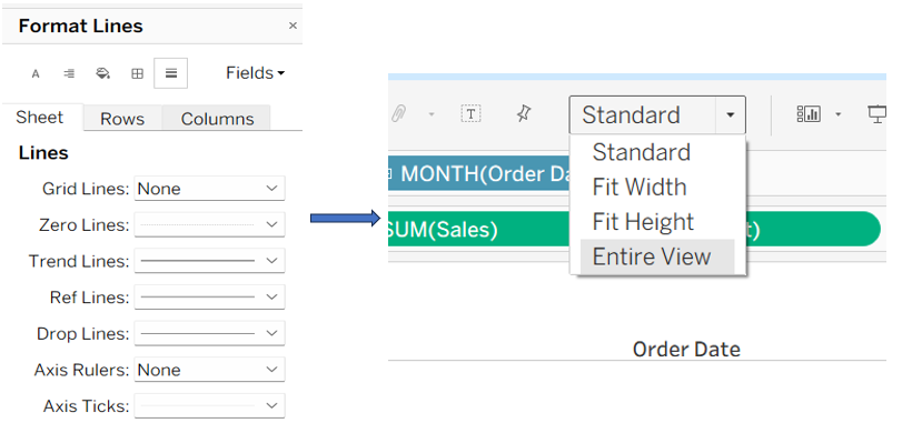 Step 6: To format the chart further, go to the format pane, under Lines, select “None” to remove grid lines in your view. You can also change the bar color by clicking on the color option in the sales marks card.