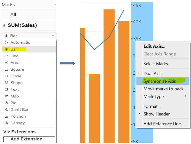 Step 4: In the Marks card, click on the chart type dropdown menu for Sales and select Bar. Next, go to the right-hand side axis, right-click on it, and select Synchronize Axis from the menu, this synchronizes the numerical scale.