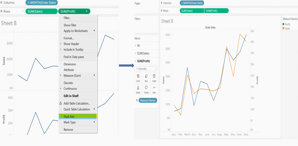Step 3: In the row shelf, go to the dropdown of the second pill (Profit) and click on Dual Axis, you will notice profit and sales line graphs combine.