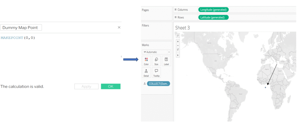 Step 1: To generate dummy points on the map, create a calculated field (dummy map point) using makepoint (0,0) formula, now double-click on the newly created field, Tableau will automatically place Longitude and Latitude in columns and rows shelves and show a dot on the map.