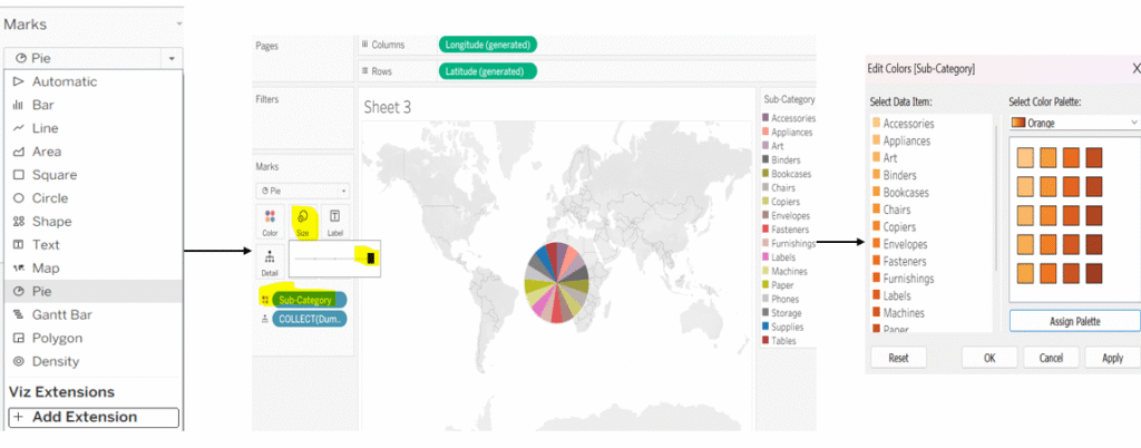 Step 2: Go to the marks card and change the type from map to pie. Place sub-category on to the color in the marks card and increase the size of the pie for better visibility, you can edit its color according to your requirement by clicking on to the color marks card.