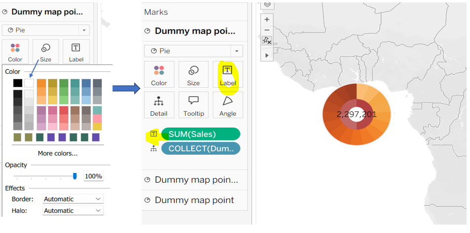 Step 4: Drag the same calculated (Dummy Map Point) field to the map layer again and repeat the steps. For the innermost center layer, choose a white color so it looks like the center of a sunburst chart, and add Sales to the Text on the Marks card.