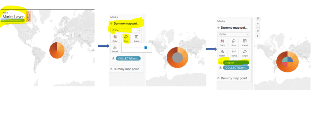 Step3: Now, place the calculated field (dummy map point) on the map layer, change the chart type to pie, resize it to create a hole in the middle, and add region to the color.